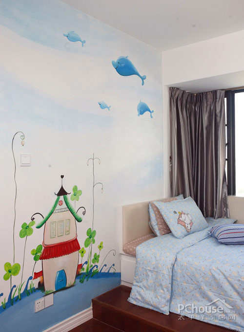 儿童房,为了给孩子更健康,快乐的成长,多些乐趣,我们在墙上添加了手绘图,视觉上有增大空间的效果,也让孩子更喜欢自己的房间, 在手绘图的选择上,我们亮一些的颜色,根据空间的风格,确定了这个手绘图。床品也和整体空间相配合。