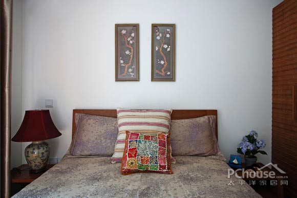 老人房采用的床品是比较素雅的样式,看起来舒服就可以,加上亮一点的颜色点缀一下,床头挂的是两幅和整体风格统一的装饰画。