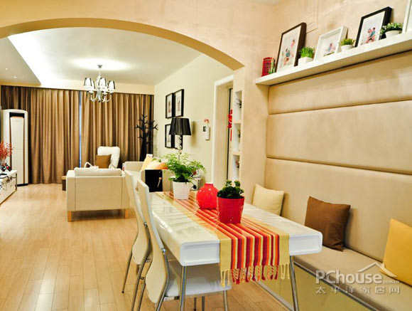 餐厅背景墙采用米黄色的仿皮材料,倍显温馨,顶部还设计了隔板相框的展示,可以把你们曾经甜蜜的时光记录并展示出来,比浪漫更值得向往的,是家的味道。