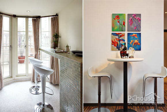 若是家里还有那么一点白色的风景,不妨可以搬一张高茶几,配上两张小巧的酒吧椅,一瓶两人至爱的红酒,轻酌淡饮,颇有私人酒吧的风情。
