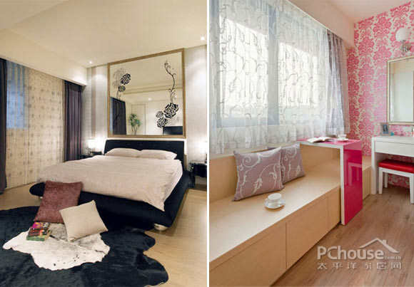 卧室以桃花色为主色调,白色烤漆木作门片点缀桃红玻璃,展现一致性的优雅风格。壁纸是营造情调的高手,半边墙纸,足以能够令到房间视觉雀跃不少。