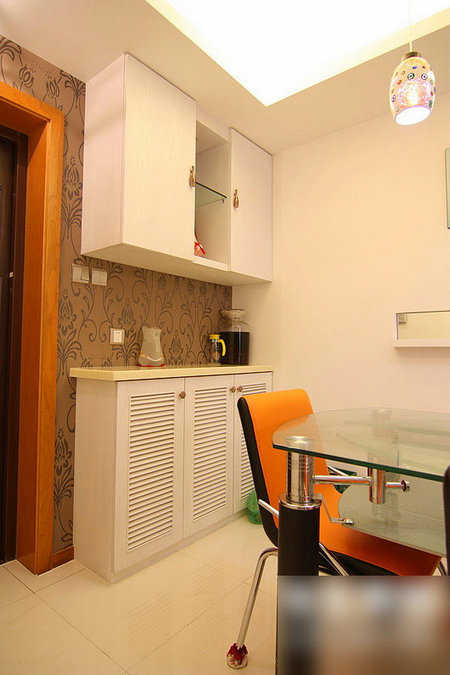 餐桌旁的一墙柜子正担起了家居收纳的责任。上面是不通风的板面,下面是透风的鞋柜。不同的东西就按不同要求摆放好。一点也不乱。