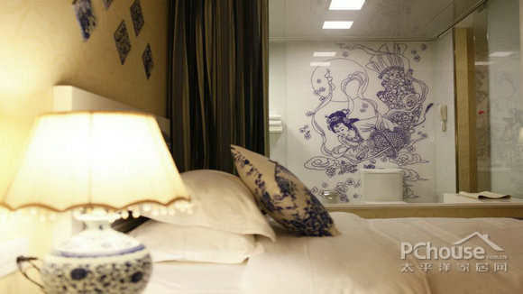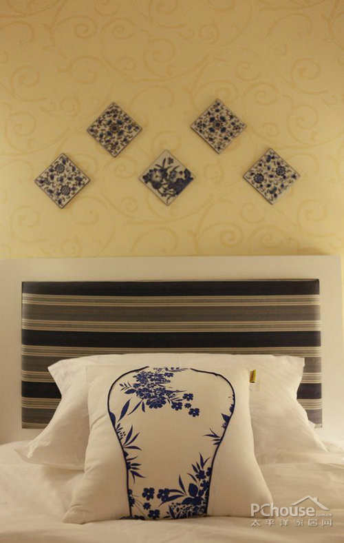 房间里连靠垫都是青花瓷瓶的图案,每件饰品的挑选都可以看出设计师细腻的心思。
