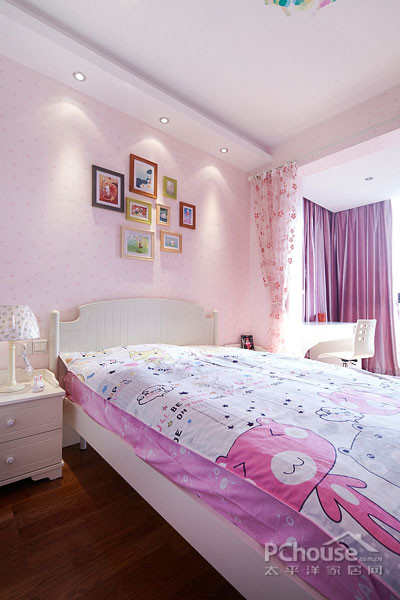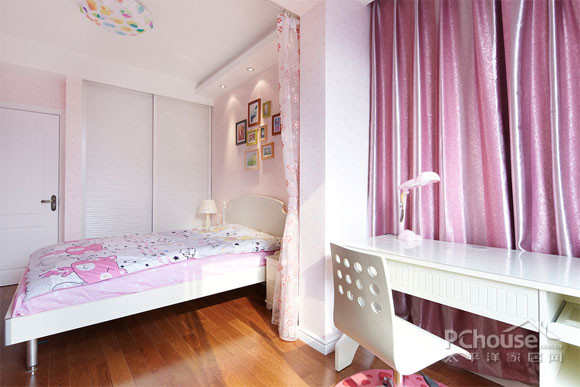 粉色的儿童房与房间整体风格是分开的,单独设计的好处是可以给孩子一个完全属于自己的世界。格调清新谈雅,白色的儿童床和白色的书桌给孩子一个纯净的天空。