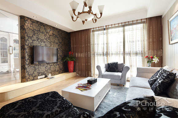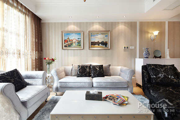 【太平洋家居网 设计频道】有一种感觉叫低调的奢华,就像本案的客厅带给人们的感受一样。电视背景墙采用欧式的富有金属感的花纹壁纸,侧边的镜子设计使空间更加敞亮,沙发采用白色皮质搭配黑白相间的抱枕,完美呼应。