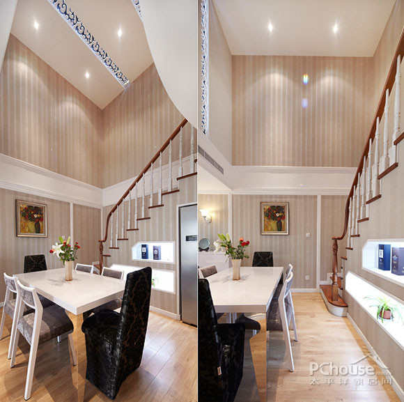 餐厅设立在楼梯处,楼梯间的墙壁也被设计师巧妙的利用起来。桌椅的选择依然采用黑白相间的经典色搭配。