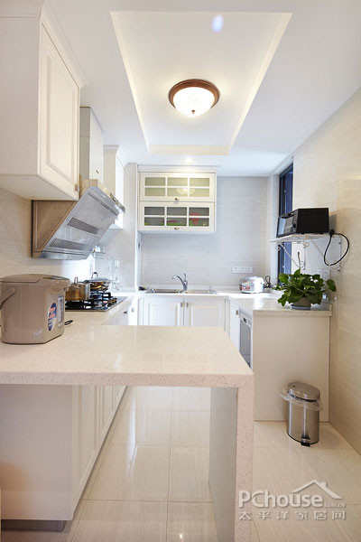 现代化的家居,壁柜的设计为杂物安了家。大理石台面和白色橱柜搭配既实用又美观。