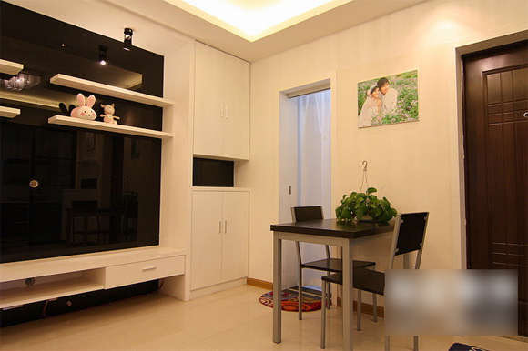 客厅中的电视柜是以白色和黑色为主色调,白漆混油工艺面积,和黑色烤漆玻璃尽显现代风格。电视墙的柜子对于本身面积就不大的两小口就最好了。