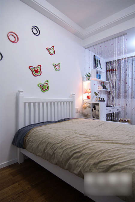 与主人房不同,孩子房的设计更现有活力。蝴蝶和圆圈的个性墙贴和珠帘的设计,仿佛让孩子懂得专时专用的道理。该玩的时候就玩,该认真读书的认真读书。