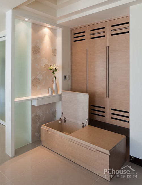 玄关:入户花园分为独立的玄关和生活阳台,入手左边是玄关柜,上半部为鞋柜,下半部为可抽拉的储物箱,还可以做穿鞋凳,柜体要做得和墙体一样厚,看起来平整有嵌入式的效果。