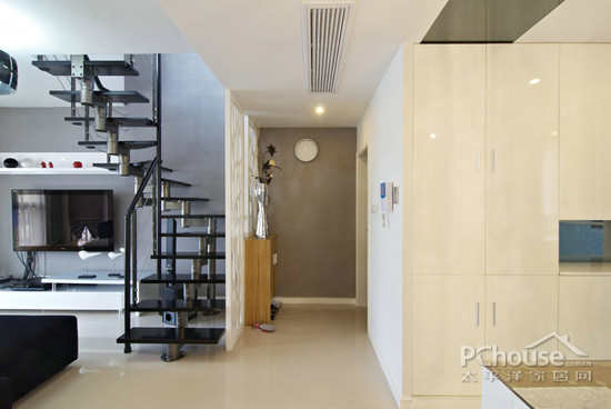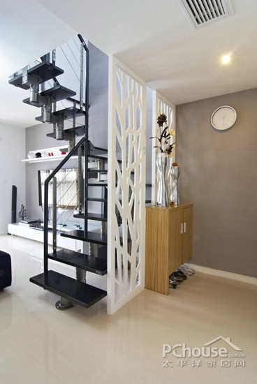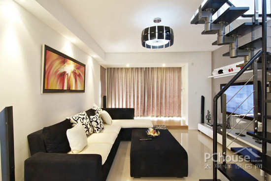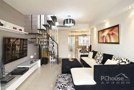 楼梯和软装的色调与墙壁地板构成鲜明的反差,显得低调而奢华。盘旋而上的楼梯使客厅具有层次感而且延伸了纵向的空间。
