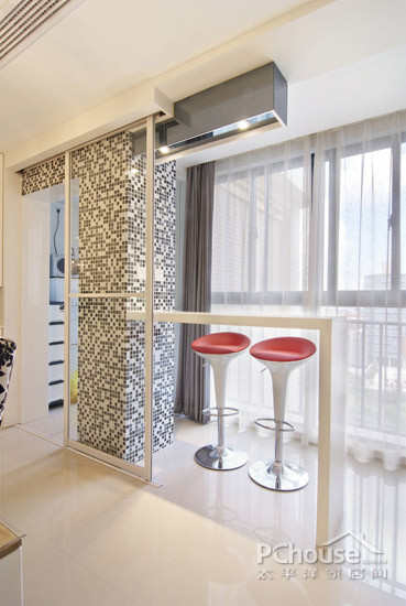 阳台落地窗前的白色吧台和线条简约的高脚椅,坐在这里休憩和欣赏窗外美景也别有一番风味。