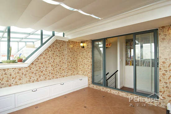 为女业主在阁楼做出的休闲区,大面积的玻璃窗和白色帆布使之温暖明亮,方便锻炼身体;婆婆也可以摆弄上几盆花草,生活中充满快乐和惬意。