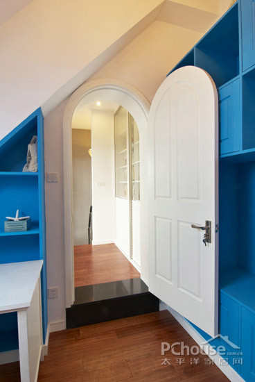 蓝色的柜子是整个书房的重点,搭配白色简约家居,让人看了心情直舒畅。