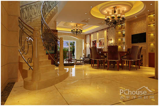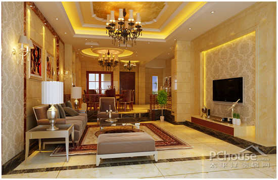 【太平洋家居网 设计频道】这个欧式设计,给我们的感受可以用“金色的旋律”来概括。大吊灯的色彩是低沉的金色,壁纸也是印花的淡黄色,整个空间上给人一种奢华的视觉感受。