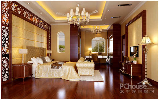 主卧室以木材为主要的建筑材,木制的地板,木镂空成花的装饰,木质的家具。格调依然是金黄的奢华风,是中国风和欧式风的完美结合。