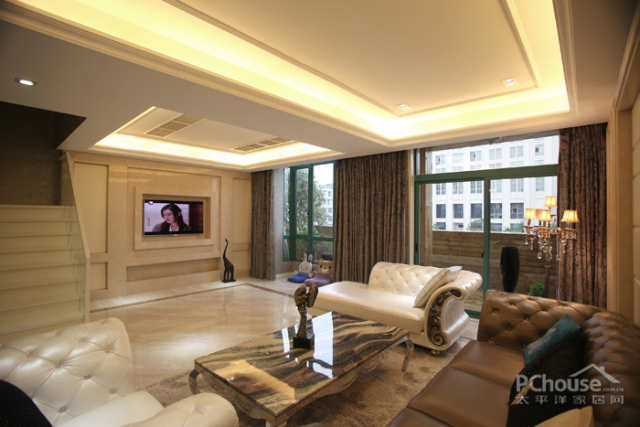 客厅空间比较宽阔,所以沙发背景的材质也同样与电视墙一致,以达到统一色彩、材质,在造型上区分变化。经典的新古典沙发家具在简约的空间中显的特别有气质,赭石和白色也在米色环境中更能相称得体。
