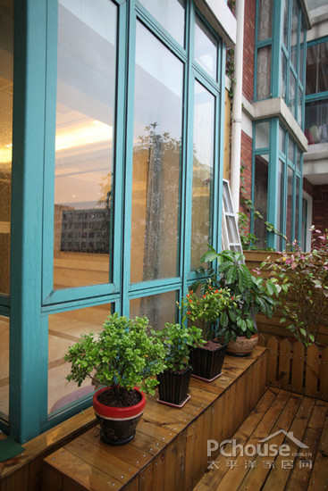 客厅角落的小阳台利用木料全部铺设起来,可以把玻璃门外的自然绿色引入室内,也成为客厅的一部分!