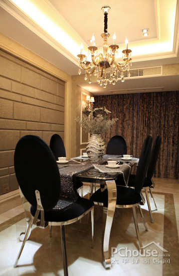 餐厅是欧式风格的设计,大黑色的餐桌和餐椅与周遭环境设计紧密联系,优雅协调。