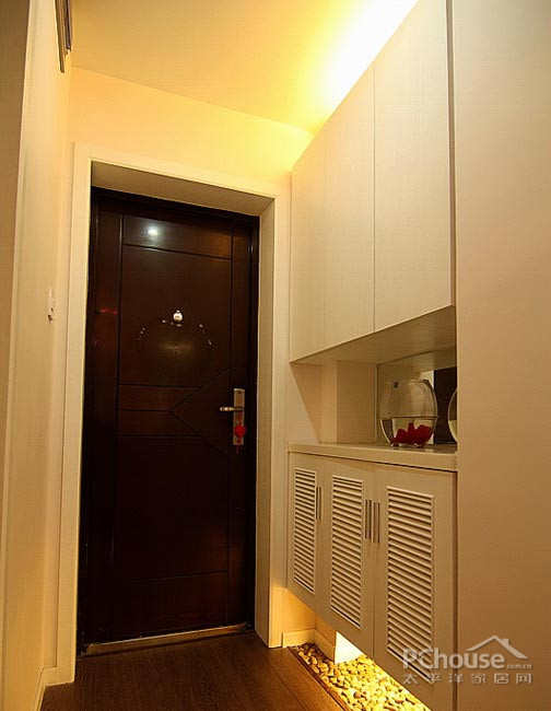 玄关:嵌入式的玄关柜大容量的收纳进门物品,同时在细节设计上,中部掏空,下部悬起,顶部可以留出安装照明,营造玄关效果。