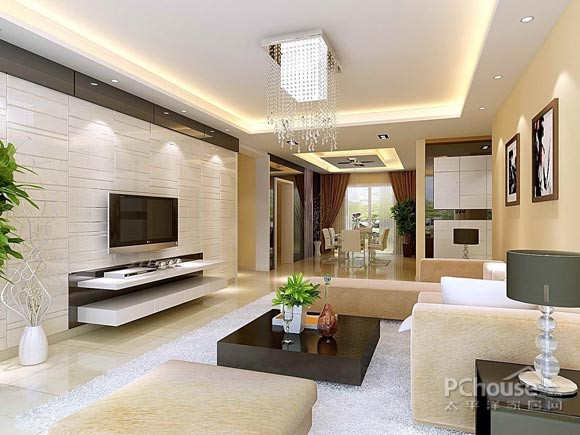 客厅参考效果:既然已经有了该有的收纳空间,为了客厅的美观大方,可以免去电视柜的收纳,改为简单的背景墙即可,配上落地或者悬起的简易电视柜,应该是网友所期望的风格。