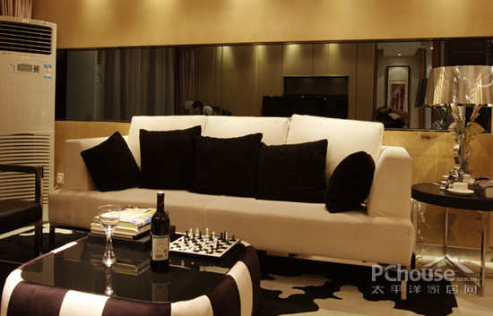 整个客厅的设计亮点就在沙发等的设计上。黑白相衬的沙发,和黑白相融的地毯,黑白条纹的桌子。设计师用最简单的颜色设计出了简洁时尚的客厅。