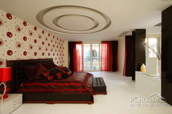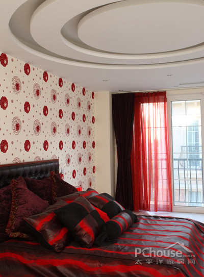 红色窗帘、红白强制和红黑条纹床品,是不是很喜庆有爱?