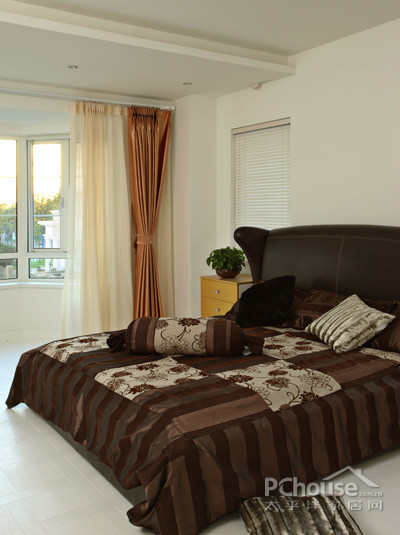 延续空间的亮白色调,这个卧室的墙壁、地板、家具都是白色的。咖啡色的床品、明黄的窗帘,这样设计是不是让卧室非常温暖?