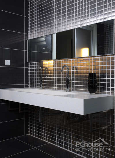 整个房子设计了两个卫生间,风格大相径庭。以黑色为主调的卫生间非常酷,圆形的浴缸和黑色马赛克完美结合。