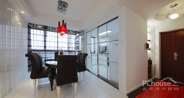 白色的墙面设计,玻璃的墙面装饰,这都扩大了餐厅空间,大窗户的设计也令餐厅的空间有了质的视觉扩大效果。