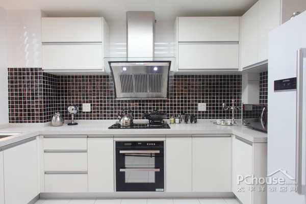 白色简洁的厨房设计,特色的是黑色的马赛克装饰,黑与白的视觉冲突,令整个空间酷上加酷!悬挂柜的应用也令空间结构紧凑,收纳空间也得到了提高。