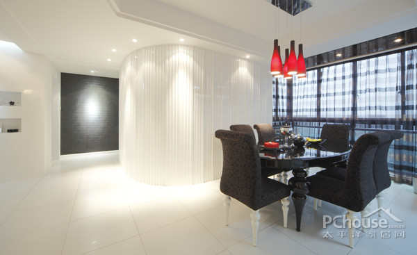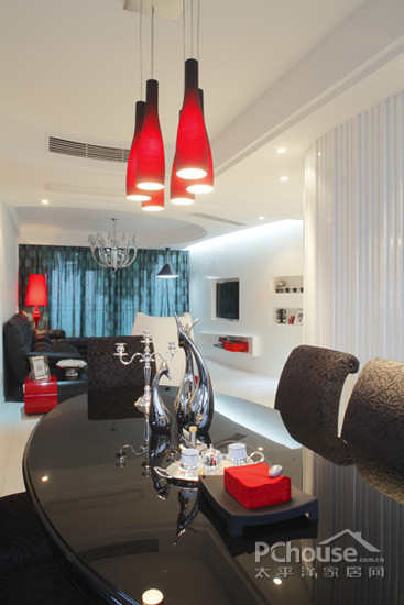 红黑白三色的设计使空间更简洁,更有力,更时尚,也更酷!拉长的吊灯设计在空间上也紧凑了餐厅的布局结构。