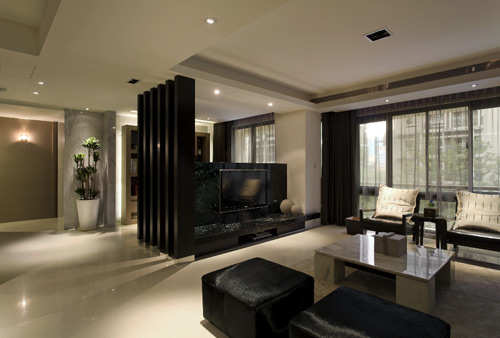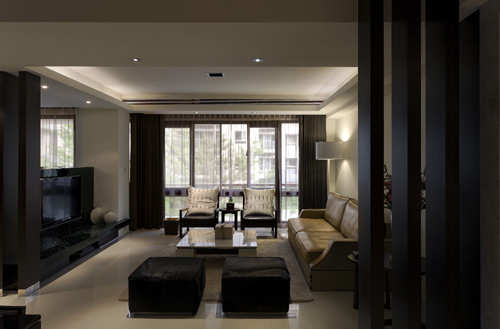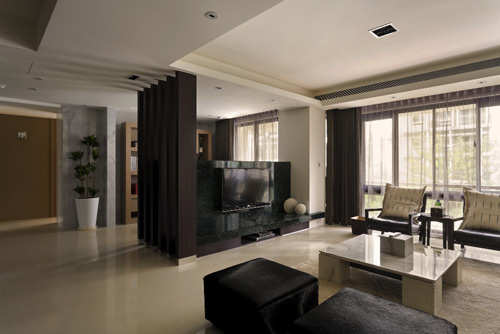 将原有的书房空间内缩,规划半开放的视觉穿透格局,不但彻底打开通透自如的视觉效果,同时也由于走道面积的加宽,营造出如大面积豪宅的开阔空间感。重色的木条格栅修饰电视柜、电视墙与书柜叁种高度的落差,光影透过格栅筛落于地坪上描出深浅阴影,加上另一侧墙面的玻璃映射,为塬本单调的走道风景,平添艺术气质与涵养。