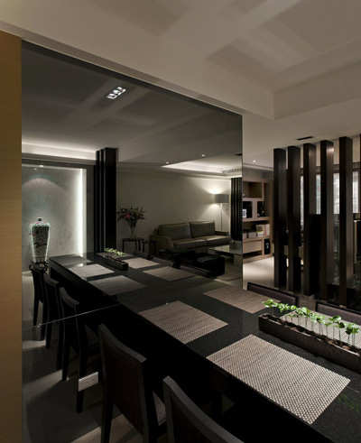 厨房门以深灰色夹纱玻璃加上铁件的处理,独具的设计美学令门扉成为餐厅的主要视觉背景,重色系营造稳重大器的设计基调,让风格更形强烈,夜晚开灯后,视线隐约穿透,加上两旁壁灯的投射,展演内敛高雅的品味风範。餐厅墙面以L型灰镜包覆,镜面投射一景一物,具有餐桌加长的错觉,增添画面的趣味与变化,玻璃切割高度与餐桌切齐,转折后的另一侧墙面则隐藏小孩房的暗门,线条的切割构成几何比例的画面美感,让墙不只是墙、门不只是门如此单调,成为整体设计美学的重要一环。