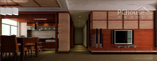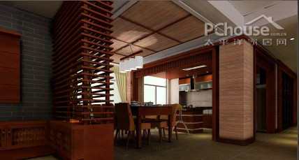 这一设计主要是以中国风为设计主题。通过各种木制的家居来营造古典气派又简单自然的特色。从效果图上不难看到客厅与书房是用简单的玻璃设计来隔开。