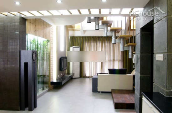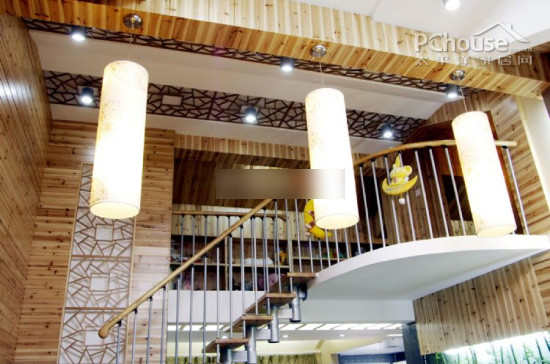 楼梯设计为开放式设计让视觉更加宽敞而且又有气质。天花的不规则的木框图案装点了旁边木板的单一感觉。