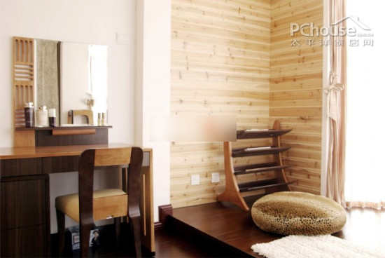 卧室的梳妆台也是有了木制结构。和旁边的飘窗设计格调搭配得相当和谐。粉嫩的窗帘颜色能带给屋主轻松舒适的感觉。