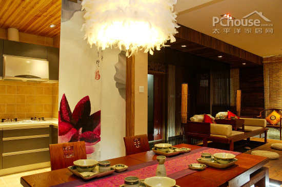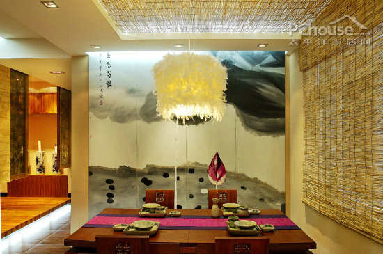 复古中国风的餐厅设计可谓亮点百出。有竹席的接连天花板的窗帘装饰。又有附上全身雪白羽毛的吊灯。这可谓复古与时代感相结合。