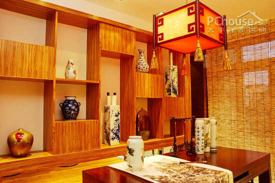 书房设计中除了中国风的方形吊灯之外,还特意设计一个花瓶文艺展示柜。不同大小的方形结构可以适应不同大小的展示工艺品。