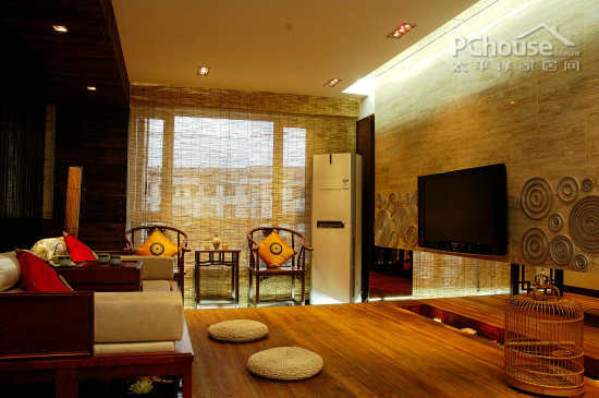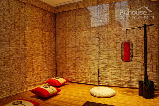 谈天说地的和室空间就沿用竹席来隔开空间。具有古代风味的灯架和盘腿而坐的设计,不禁让人想起东瀛风格。