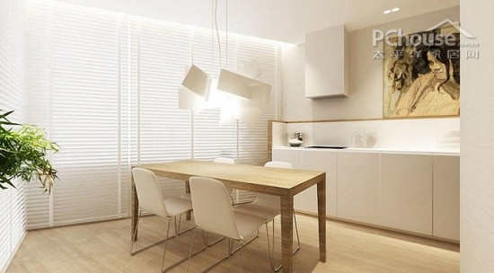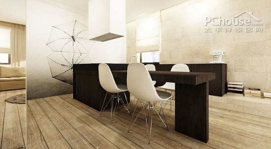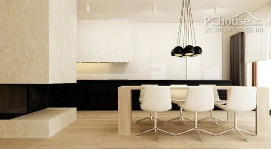 在餐厅的设计中,沿用了以米白色为主色调的颜色方案。餐桌椅以及墙体都是均一的颜色,非常简约。而在吊灯以及橱柜的颜色上,则选用了构成强烈色差的黑色,黑白的经典搭配,令空间正气清爽。