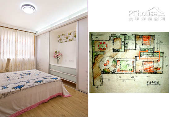 卧室设计:改变主卧入口,留出位置做嵌入式衣柜,并把收纳柜延伸到主卧阳台外面,整面墙的收纳量足够大。衣柜中部可以设计放置电视,拖拉门收纳也十分的美观。