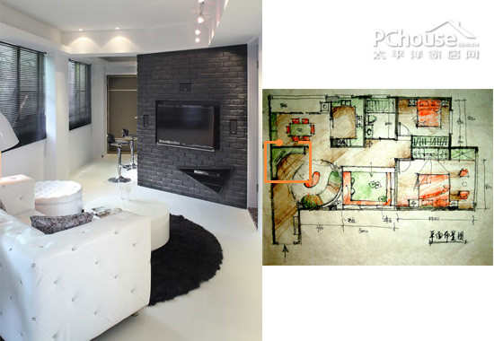 客厅设计:原本的公共区域划分为休闲区和客厅,使得客厅的面积减少,客厅主墙如何安排呢?设计师采用了对角的设计方法,一次性解决,电视背景和沙发背景极其不对对称的问题。