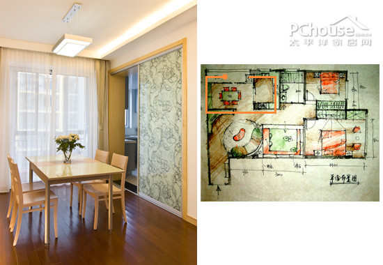 餐厅设计:拆掉餐厅和厨房之间的墙体,厨房入口改到餐厅这边,拖拉玻璃门作为间隔。更加符合业主的使用习惯。