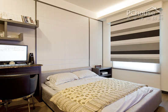 次卧设计:以黑白为主调,简单的格子背景和黑色板式家居,大方耐看。