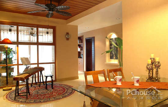 餐厅旁边的古筝可以看出主人家的高雅趣味。同时古筝也起到了装饰的作用。