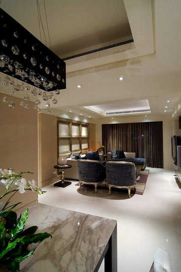 以错落格柜的方式、配置间接光源,将书柜设计兼具展示柜的使用机能,并营造出空间光影层次的丰渥变化。以天花的层次设计及二张休闲单椅作为客、餐厅开放接口的区隔因子。透过开放式吧台做为餐、厨之间的界定变化,同时增加空间丰富的使用机能特质。