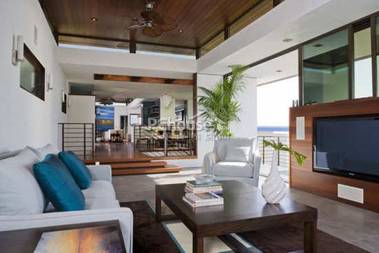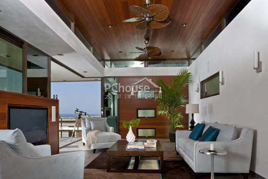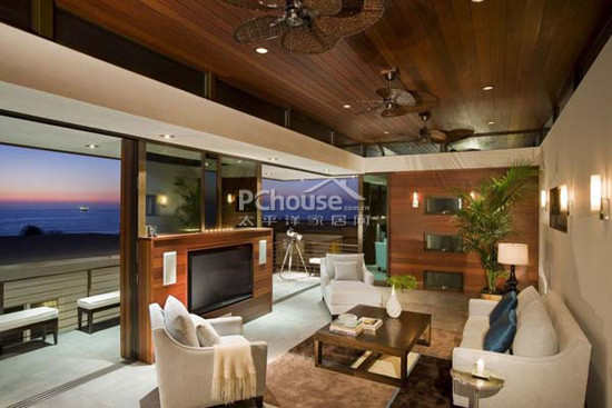 海滩的景观为这个现代的居住空间创造了一种引人注目的效果。
