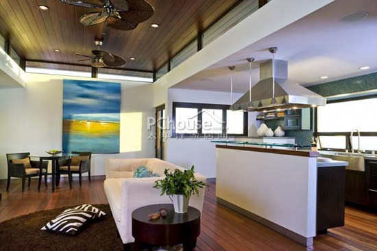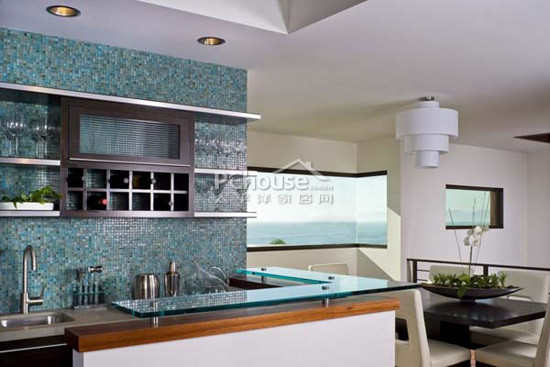 厨房也运用了蓝色的马赛克瓷砖,加上不锈钢的电器,蓝绿色与窗外的一望无际的大海相辉映,仿佛是现代家居中的一幅油画。