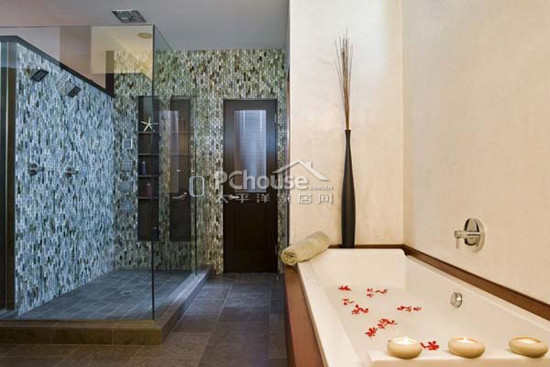 宽敞的浴室运用了蓝色的马赛克瓷砖,具有典型的现代气息之余,又增添了温暖的感觉。